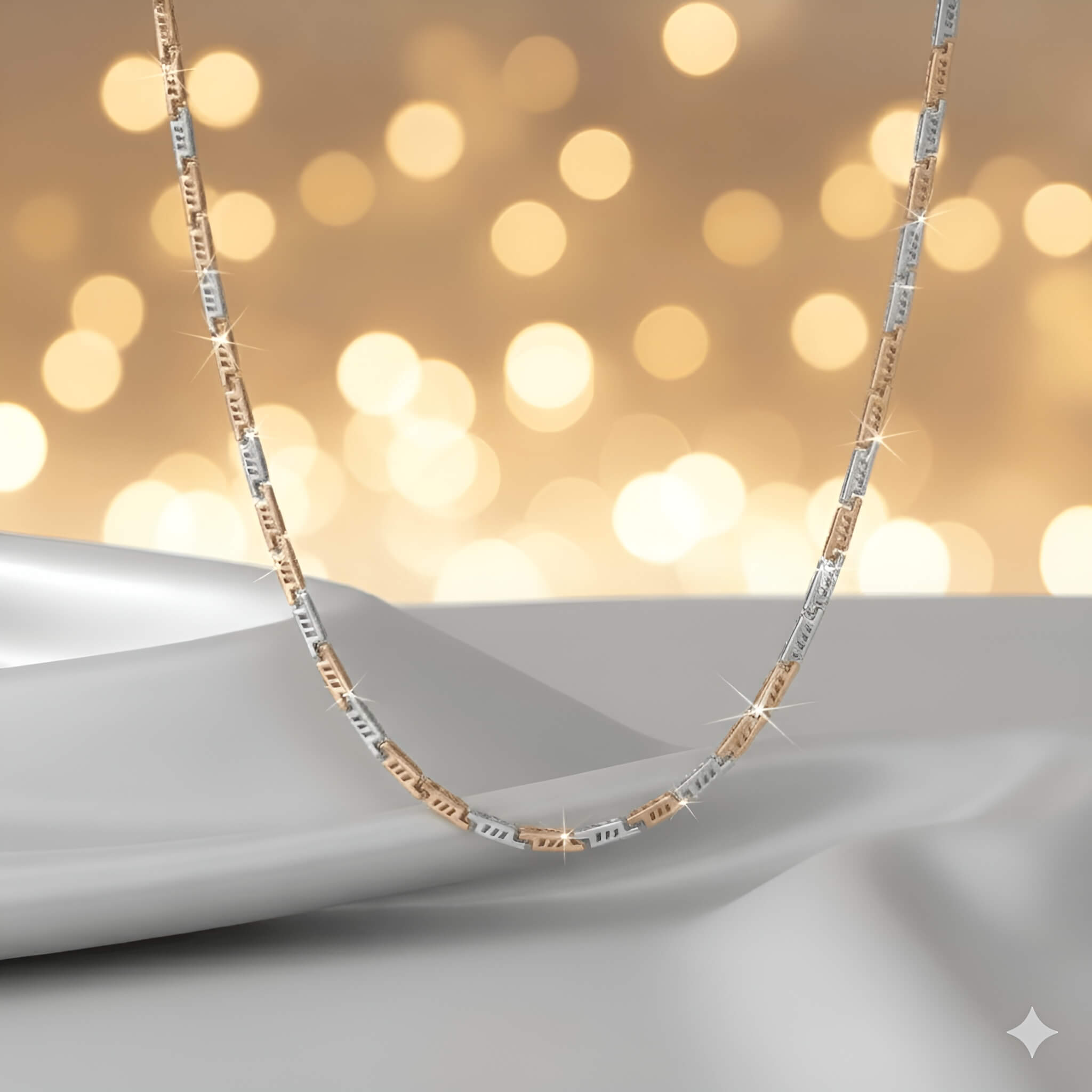 Experience refined elegance with this meticulously crafted two-tone chain. Its distinctive link design and shimmering finish offer a touch of sophisticated style, perfect for daily wear or special occasions.